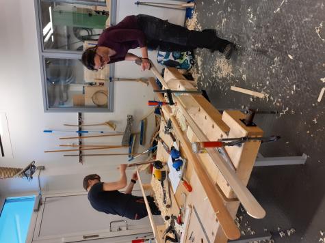 Markku hade förberedd materailet, limmat störstadels kvistfrit gran så alla hade en 3kg-träbit till att börja med. Efterhand som vi hyvlade och slipade främ paddeln kom alla ned på under ett kilogram och rätt så raka linjer. Även en långa alaska-paddeln som är slät på power-sidan och kantat på den andra blev till.