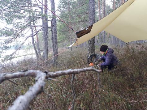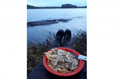 Regnet upphörde lämpligt då jag fått upp min hängmatta och tarp och jag kunde sitta vid stranden och koka middag. Att packa ihop några friluftsgrejer för en ennattsgrej går på rutin, men jag upptäckte att helt rutinerad är jag då inte, för jag saknade både matolja och te. Oljan kunde spela roll, men tekoppen jag hade tänkt avnjuta efter maten hade jag gärna velat ha. Och jag fick omvärdera min bild av hur rutinerad jag egentligen är. Min vän föreslog tallbarrste på chatten. Sagt och gjort – det är väldigt länge sedan jag gått någon överlevnadskurs, så några bittra minnen finns inte längre kopplade till smaken.